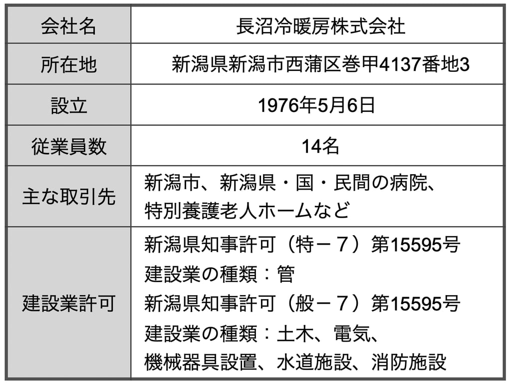 長沼冷暖房株式会社は1969年創業で新潟市が政令指定都市になる以前の新潟県西蒲原郡巻町の時代から現在の場所に本社を構えて空調機器・給排水等の工事を主に行っている地域密着型の企業です。